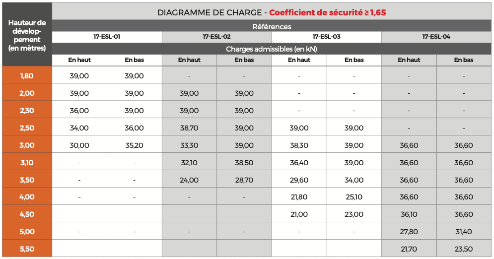 Le diagramme de charge offre une visualisation claire des capacités de l’étai. Il indique les limites de charge à ne pas dépasser pour une utilisation sécurisée de votre équipement.